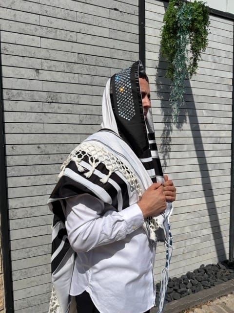 Black striped wool Tallit featuring a crystal studded Atara and luxurious hand braided fringes for a royal and modern prayer experience.