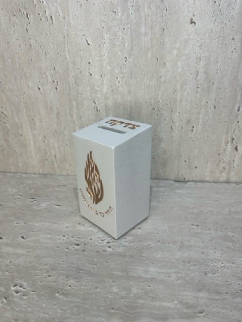 A unique and moving Tzedakah box featuring a clean modern design crafted from high quality stone like material with a subtle texture for a natural and meticulous look. The front showcases the iconic Breslev flame emblem along with the powerful Hebrew inscription My fire shall burn until the Messiah comes as promised by Rabbi Nachman of Breslev. This piece combines the spiritual power of giving with contemporary aesthetics making it a meaningful must have for any home or office connected to the legacy of joy and faith.