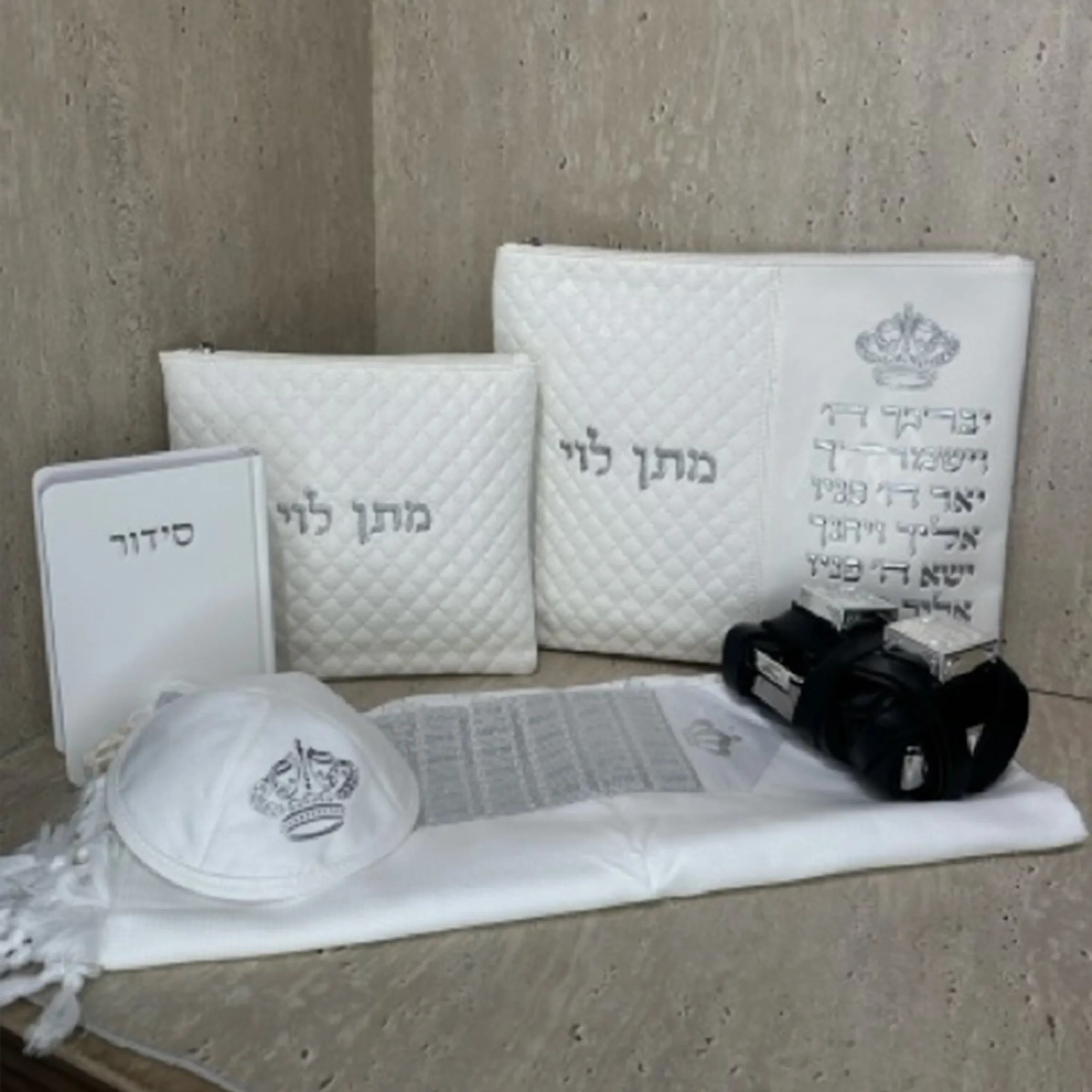 An exquisite white and silver prayer set featuring quilted bags a Siddur and a matching Kippah for a truly royal and distinguished look.