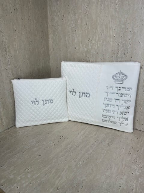 כיסוי לטלית ותפילין דגם מתן לבן כסוף