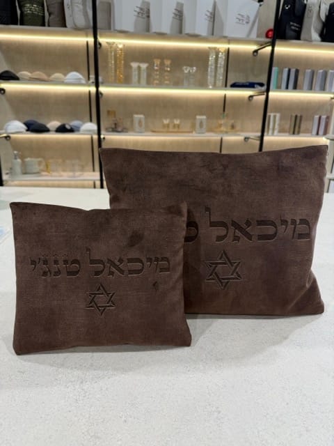 תיק לטלית ותפילין קטיפה חום מהודר בעיטור מגן ושם