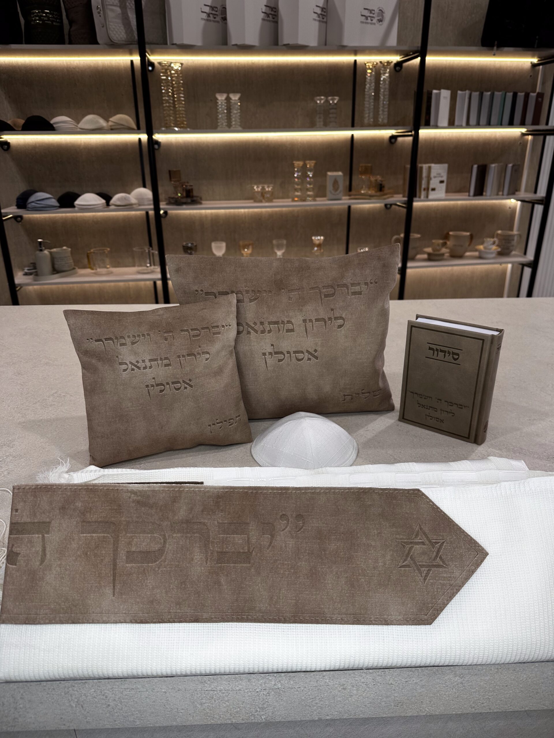 • הטבעה בולטת של שם החתן (פרסונליזציה) או פסוקי תפילה בעיצוב טיפוגרפי נקי.
