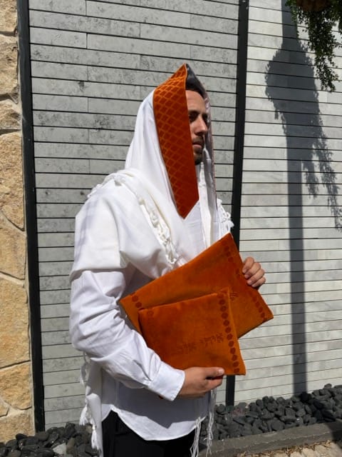 סט מהודר של טלית צמר רחלים ותיקי קטיפה תואמים בגוון כתום נחושת המעניקים מראה מלכותי ויוקרתי לכל זמן תפילה.