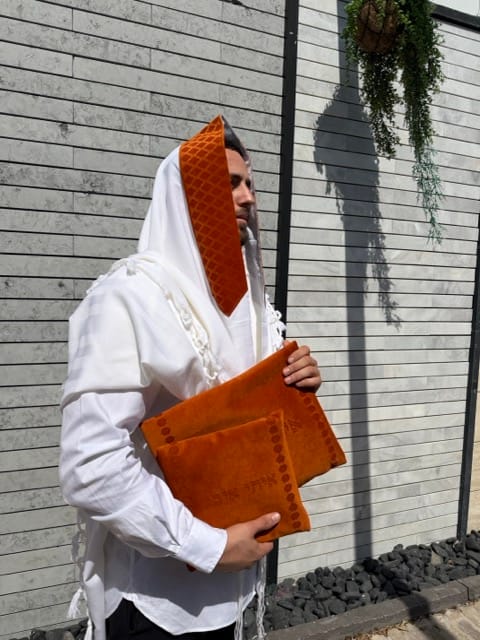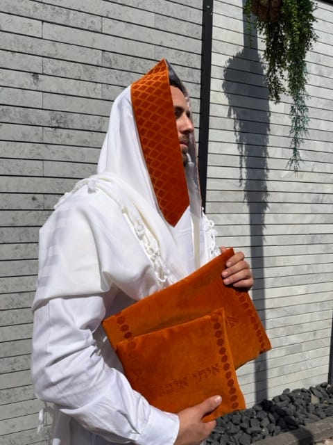 סט מושלם ויוקרתי הכולל טלית צמר רחלים טהורה ותיקים תואמים העשויים קטיפה איכותית בגוון כתום נחושת עמוק. הטלית מעוטרת בעטרה מעוצבת בדוגמת מעוינים גיאומטרית המשתלבת בהרמוניה מושלמת עם נרתיקי הטלית והתפילין המעוטרים באותה שפה עיצובית. זהו פתרון אסתטי ומהודר המעניק מראה אחיד ומרשים לכל מתפלל המחפש איכות ללא פשרות ועיצוב מודרני בעל נוכחות חזקה.